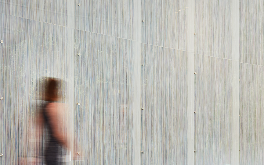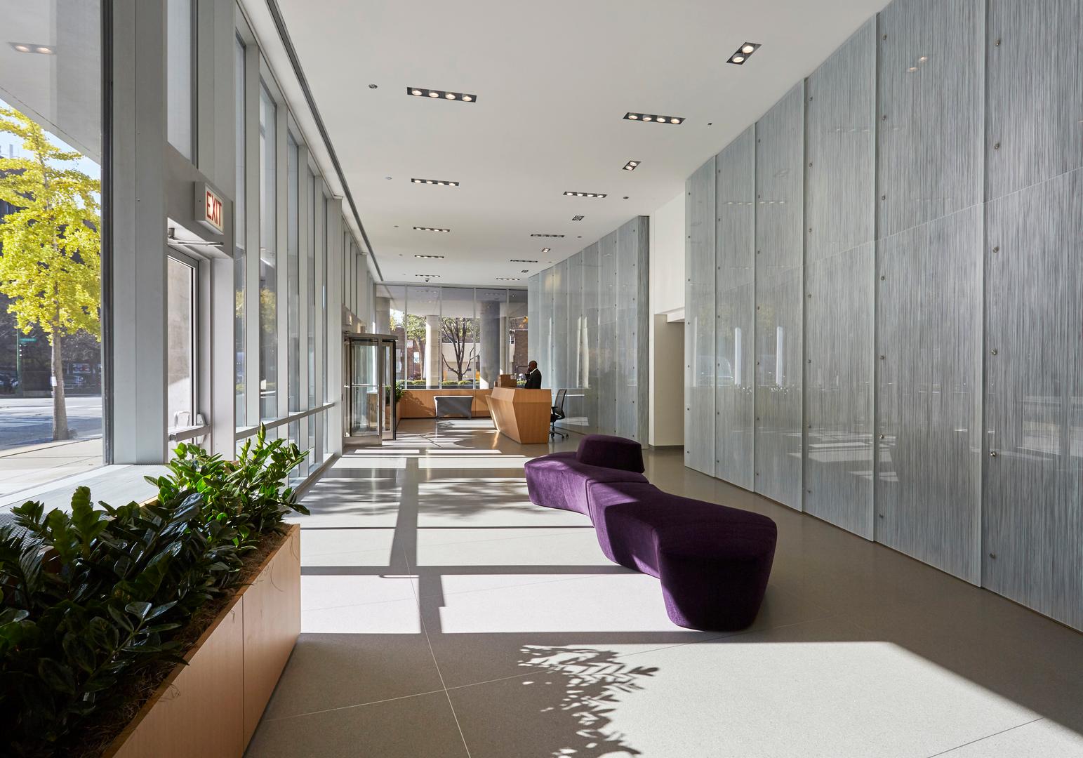 The back-lit glass wall of doors in the lobby resolved two challenges, concealing the boxes and deliveries that are a constant of any building, while enhancing the environment with adjustable levels of light — a compliment to the simple, modern, and clean space.