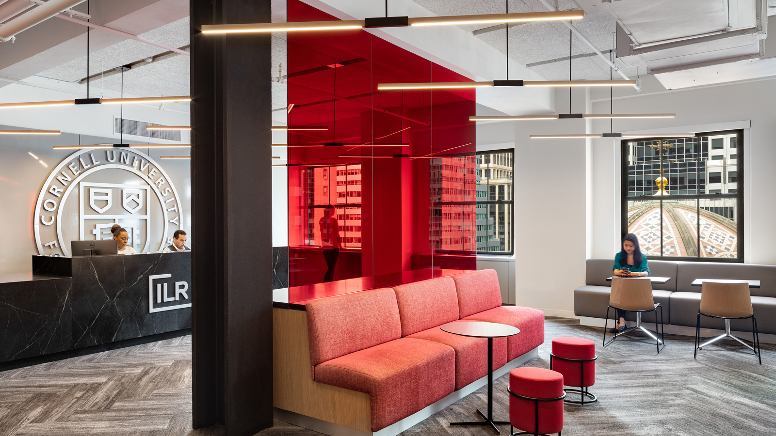 A vivid red glass feature wall brands Cornell University ILR School’s new space in NYC.