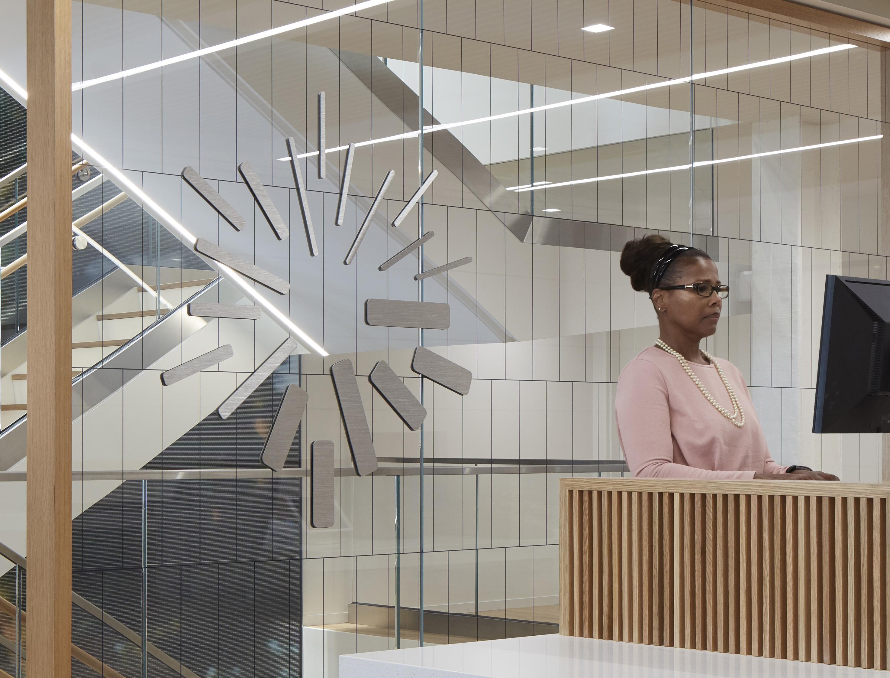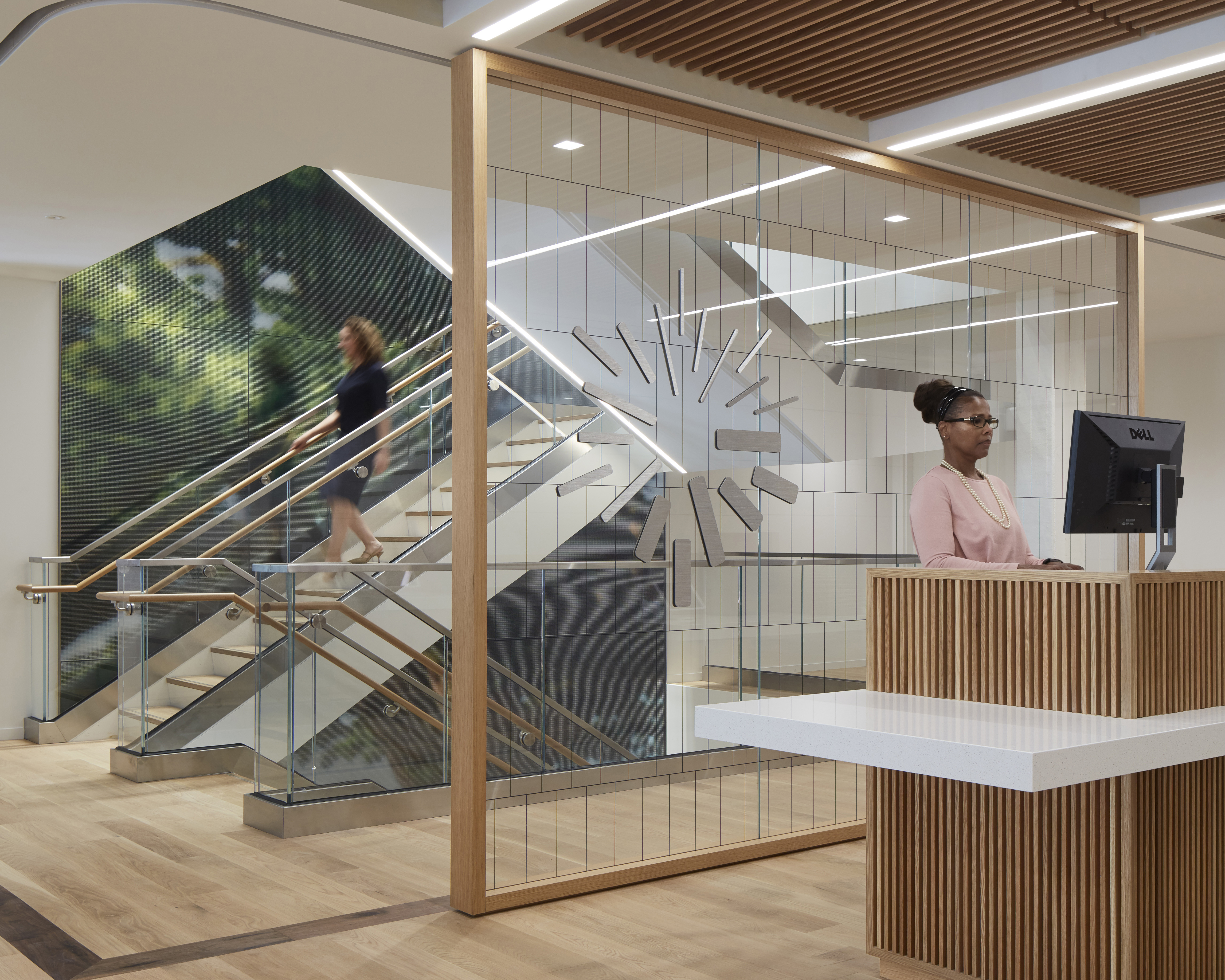 Digitally printed glass partition behind reception with three story glass focal wall leading up the stairs.