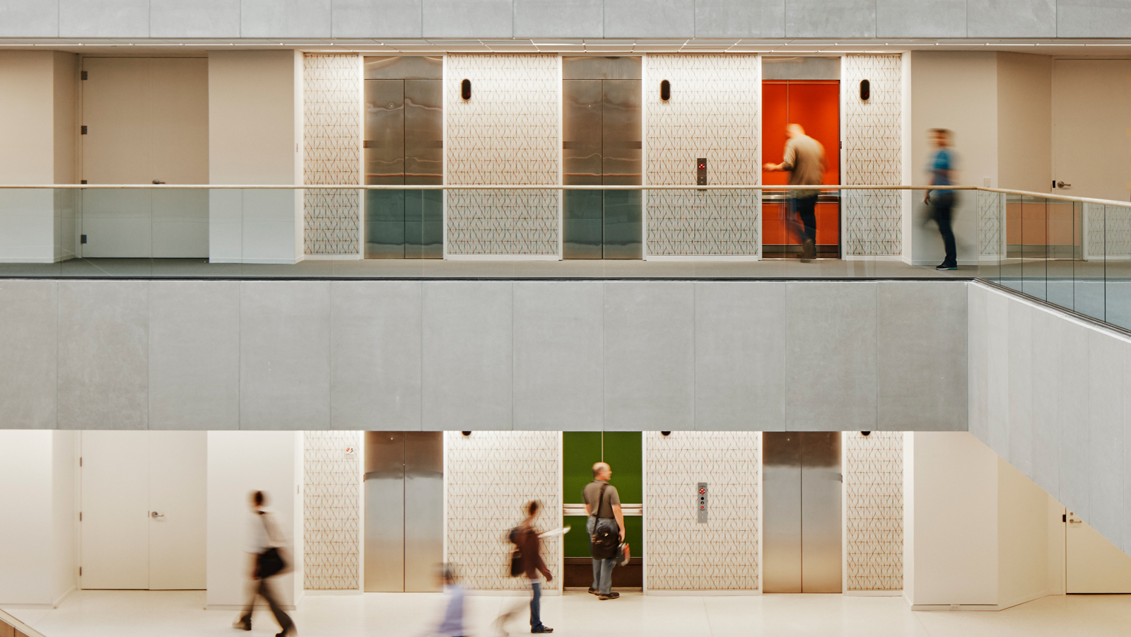 Grid by Alexander Girard spans 4 floors of elevator lobbies in the atrium at OCLC, a global library cooperative.